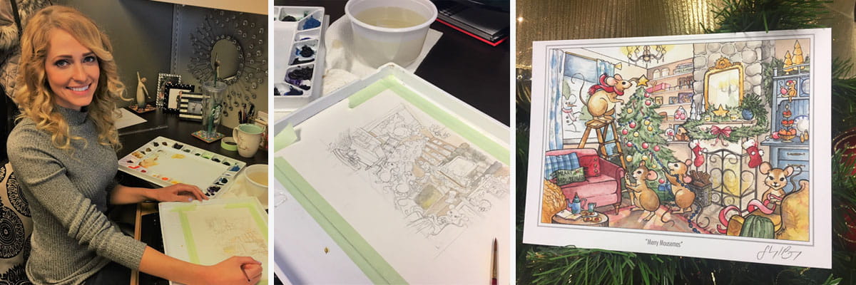 Did you know we send out custom Christmas cards to our clients and friends each year? This photo is the front of our Christmas card, “Merry Mousemas,” that we sent out this year, painted by Sheryl Boury in our office.