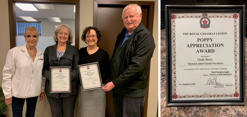 Cindy and Margaret present Kelly Watson, 1st Vice President, with a donation of $7,440 for the Abbotsford Royal Canadian Legion on Remembrance Day. The money was given by both Cindy and Margaret individually, and in conjunction with the Raymond James Memorial Fund, in memory of former team member, Martin Chambers.
