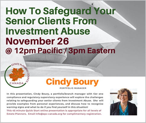 Cindy presented an educational event hosted by the Estate Planning Council of Canada on, “How to Safeguard Your Senior Clients from Investment Abuse.” She explored the challenges relating to this, provided experiences and discussed how to recognize warning signs and what to do if you find yourself in this situation!