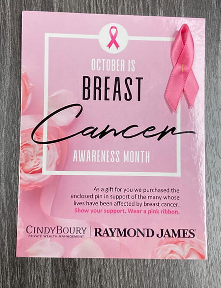 October is Breast Cancer Awareness Month. In support and memory of the many people whose lives have been affected by breast cancer, Cindy Boury Private Wealth Management supports the Canadian Cancer Society by purchasing pink ribbon pins and mailing them to our clients and friends.