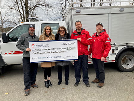 Cindy Boury delivered her sponsorship cheque to the Central Fraser Valley Search and Rescue Society through our Raymond James Canada Foundation. CFVSAR is a dedicated group of unpaid professional Search and Rescue workers serving the Cities of Abbotsford, the Langley's and Sumas Mtn.
